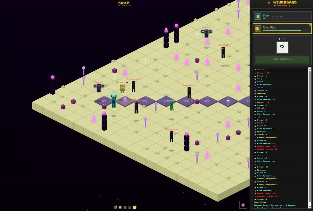 Браузерная настолка по мотивам Minecraft. Бросай кубик D10, путешествуй через 5 биомов — от Тёмного Леса до Края. 10 видов мобов, загадочные клетки, порталы и взрывные Криперы. Hot Seat с другом или бой против бота. 3 уровня сложности — от расслабленного до хардкора. Бесплатно, без регистрации!